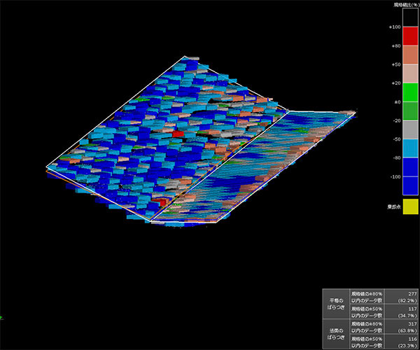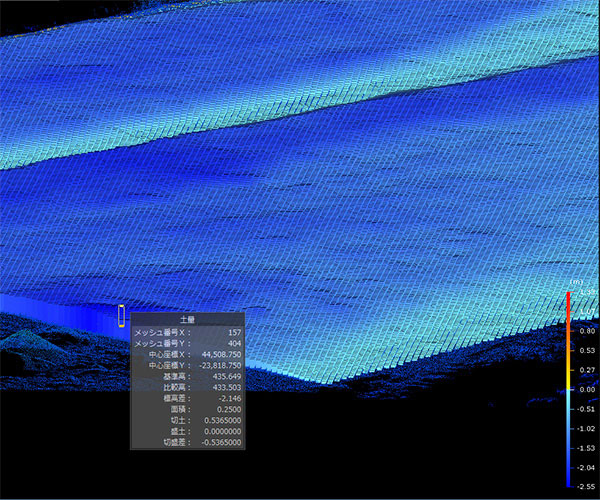 点群を多く計測することにより、高さをグラデーションで表現し3D でも確認できます。