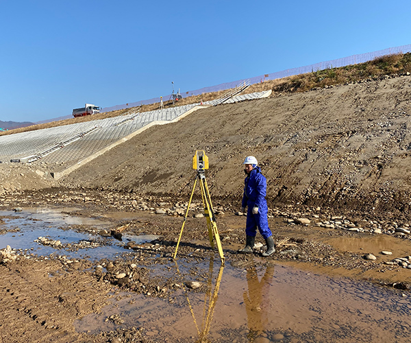 計画資料に基づき、河川又は海岸において、築造物の新設又は改修等を行う場合に現地の法線上に杭を設置し線形図データファイルを作成する作業